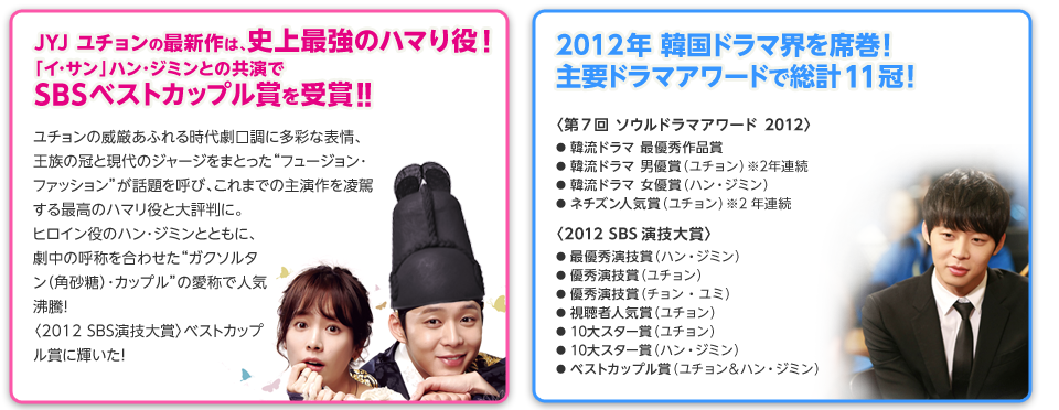 「トキメキ☆成均館スキャンダル」から約2年、俳優として進化を続けるユチョンの主演最新作がいよいよ日本上陸! 朝鮮時代から現代にタイムスリップした王子様イ・ガクを、王族たる威厳と、感情豊かな等身大の青年らしさを兼ね備えた魅力あふれるキャラクターに演じ上げた。 対するヒロイン、パク・ハ役には、清楚かつキュートなイメージで絶大な人気を誇るハン・ジミン(「イ・サン」)。息ぴったりの2人が繰り広げる“時空を超えた”ラブロマンスは回を追うごとに切なさを増し、最終回では並み居る強豪ドラマをおさえ同時間帯視聴率1位をマーク! 今韓国ドラマ界で最も熱い“ロマンス・フュージョン時代劇”の真打ちとして世界中のファンを虜にした。さらに、強烈な存在感を放つ悪役イ・テソン(「イタズラなKiss〜Playful Kiss」)、チョン・ユミ(「千日の約束」)との壮絶な争いや、イケメン臣下3人組イ・ミンホ、チョン・ソグォン、チェ・ウシクの抱腹絶倒コメディも見逃せない!